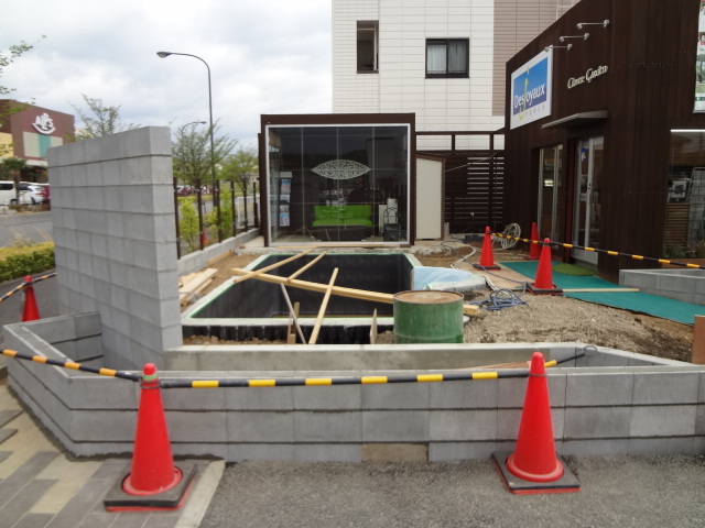 手前の花壇部分は表面に貼り材で化粧をし、奥にガラスフェンスを設置予定。
