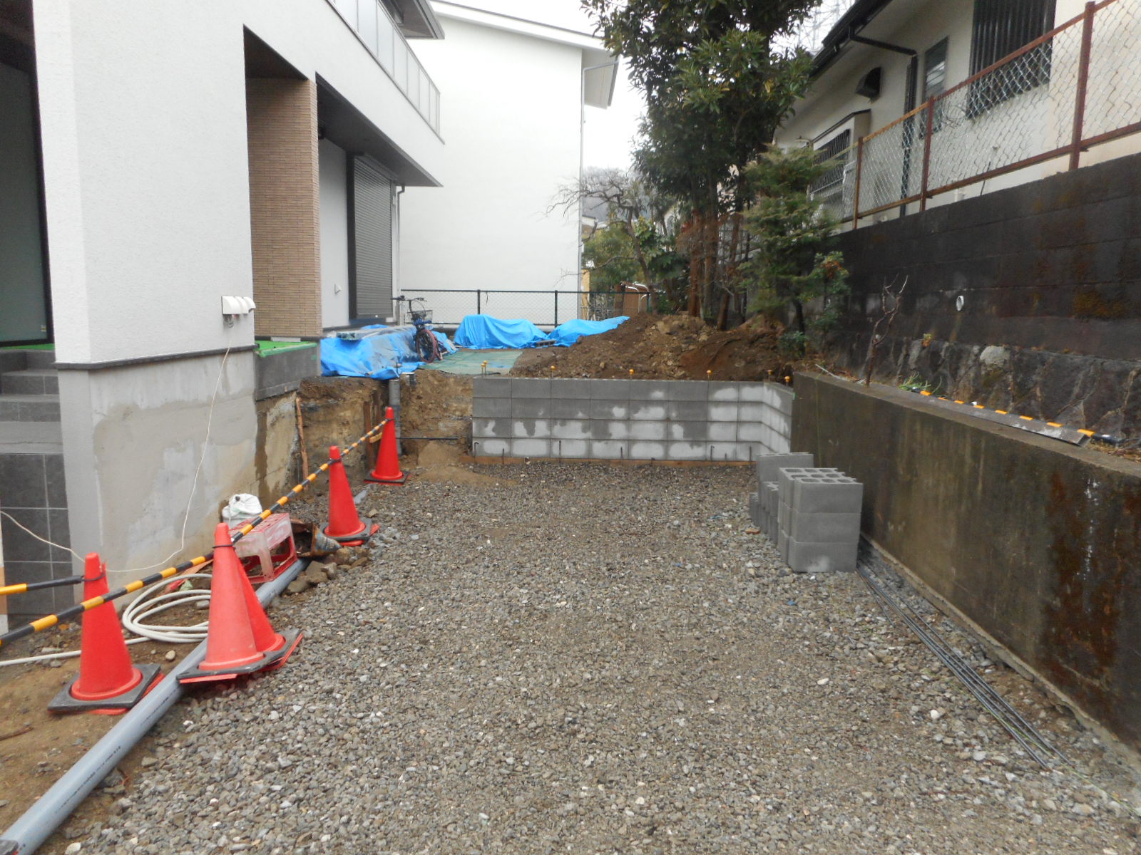 階段は、画像左上の玄関に合わせてタイル貼り、土留めはジョリパット左官をしていきます。